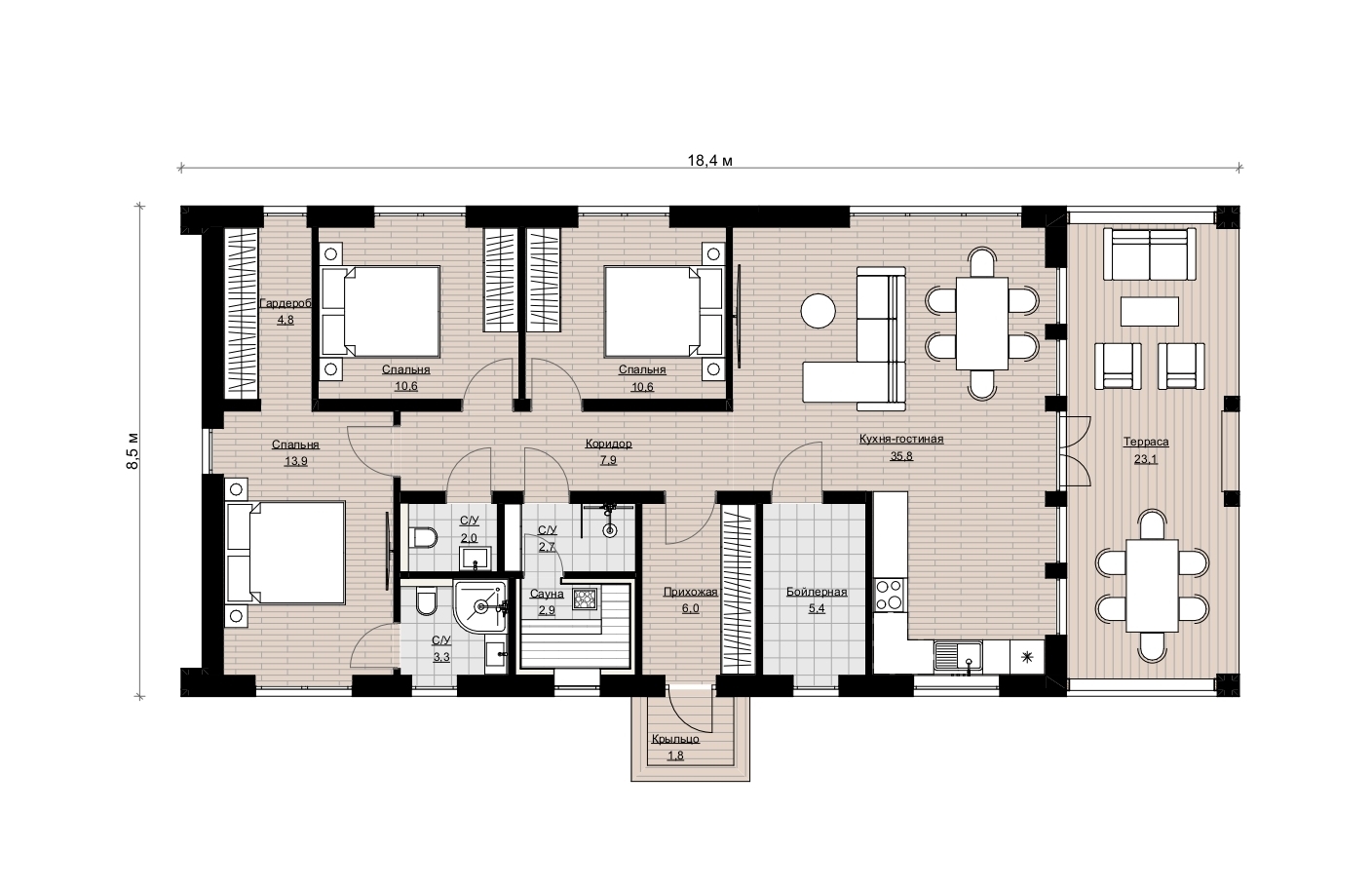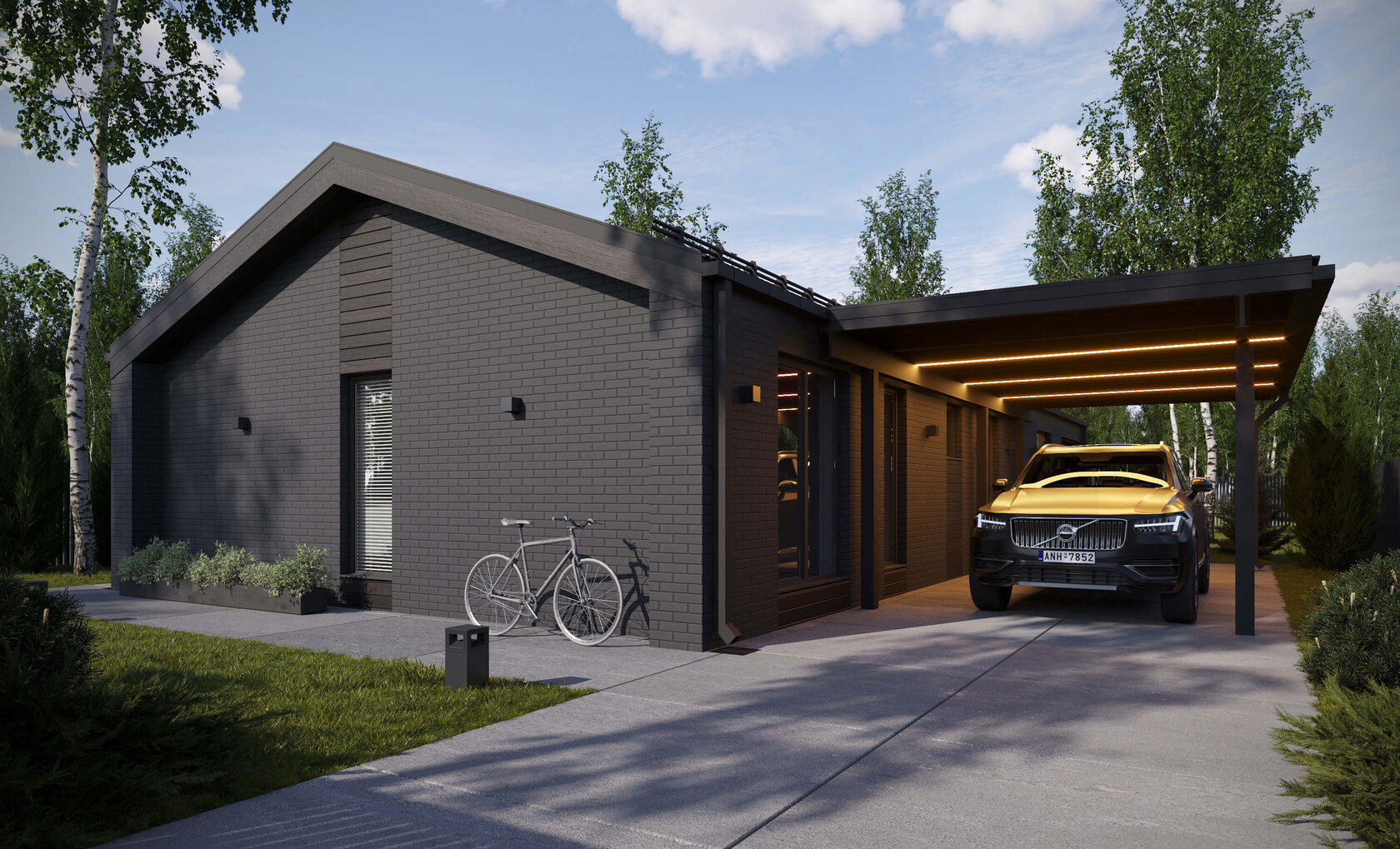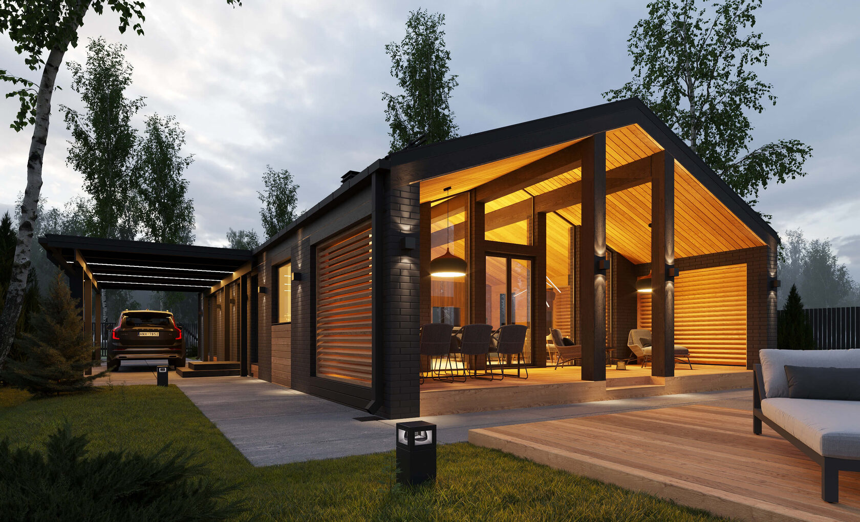 Стильный одноэтажный дом с фасадом из темного кирпича и панорамным остеклением. Функциональная планировка, включающая кухню-гостиную, три спальни, 3 санузла, сауну и гардеробную.