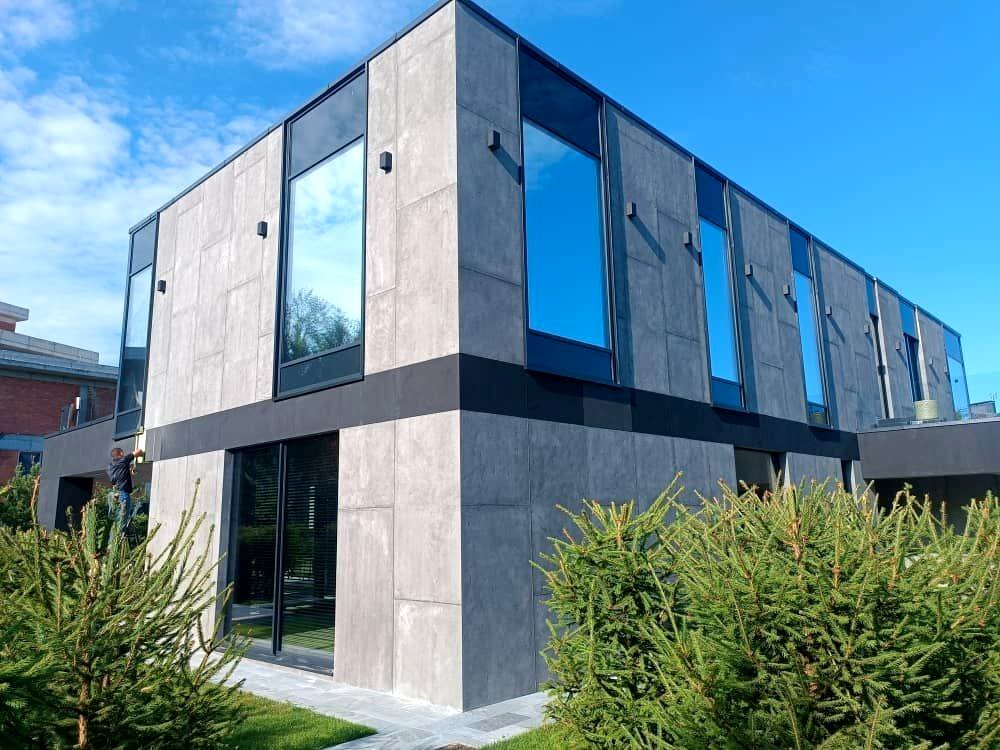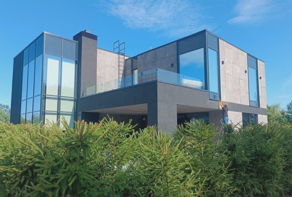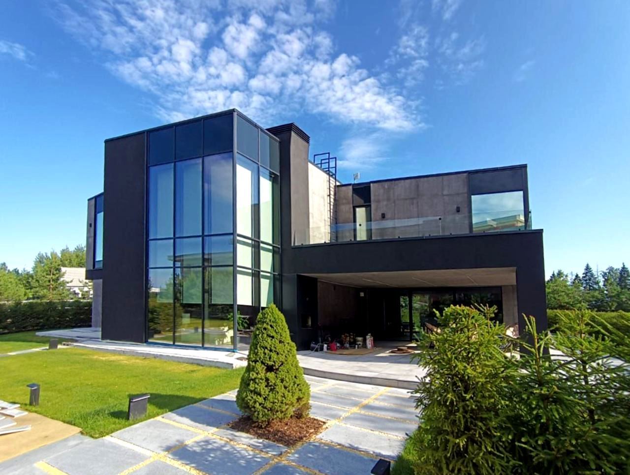 Двухэтажный дом в стиле хай-тек с впечатляющим стеклянным фасадом построен для наших клиентов в Одинцовском районе Московской области. Его интерьер представлен большой гостиной со вторым светом, кухней-столовой, тремя спальнями и кабинетом. Фасад дома комбинированный. В отделке применялись декоративная штукатурка и фасадные панели.